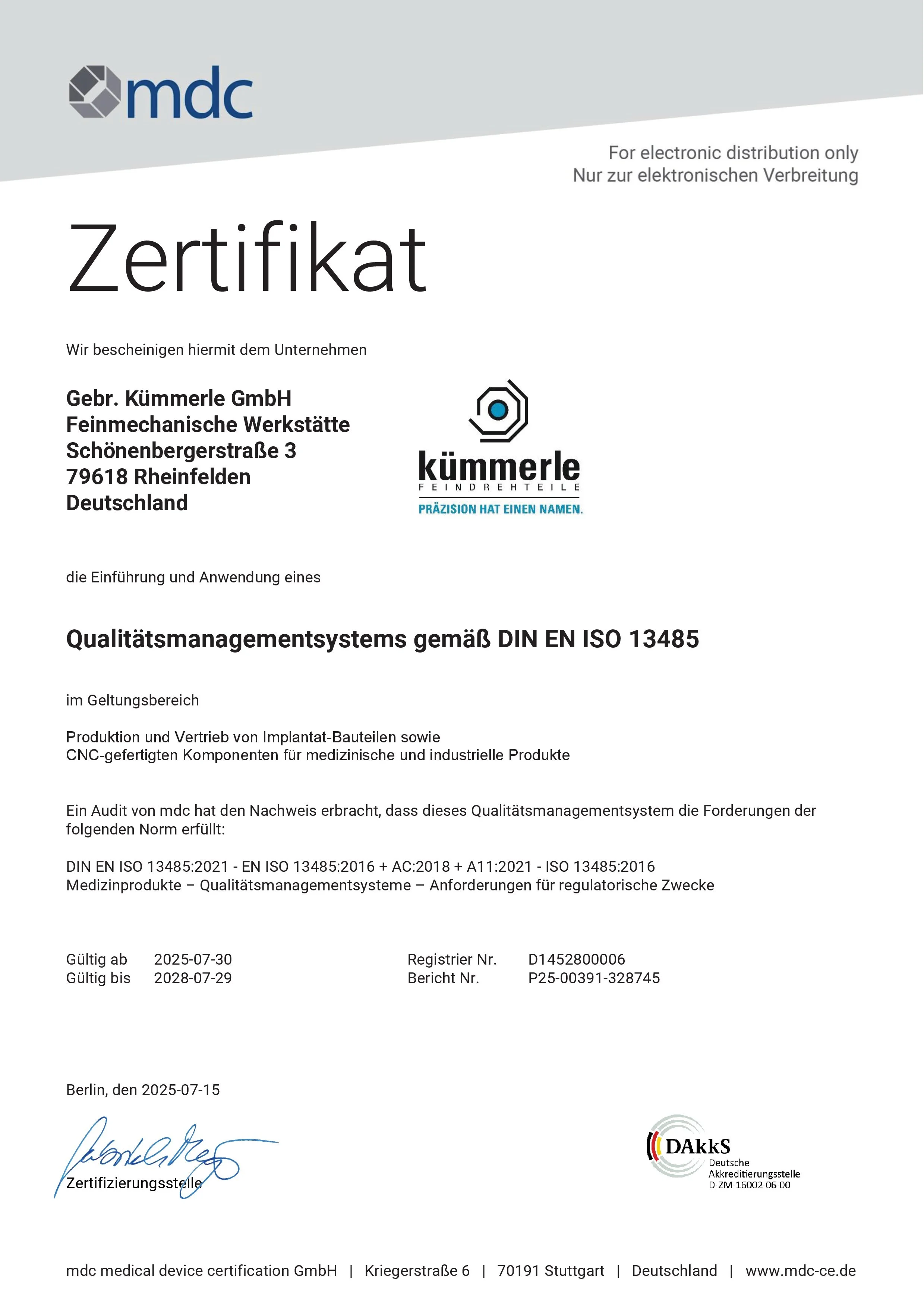 Qualität ist die Grundlage - Die Qualitätskontrolle steht dabei nicht erst am Ende, sondern ist in den Arbeitsprozess integriert: Die produktionsbegleitende, computerunterstützte Qualitätssicherung mit automatischer Dokumentation garantiert eine Produktion nach DIN EN ISO 13485. Maßgenauigkeit und Oberflächengüte werden zudem während der Produktion von qualifizierten und geschulten Mitarbeitern mit modernsten Messmitteln überwacht.